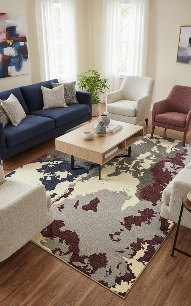 The design showcases a camouflage-inspired abstract pattern with irregular, overlapping shapes. Its layered texture creates a sense of depth and spontaneity, echoing a raw, organic aesthetic.